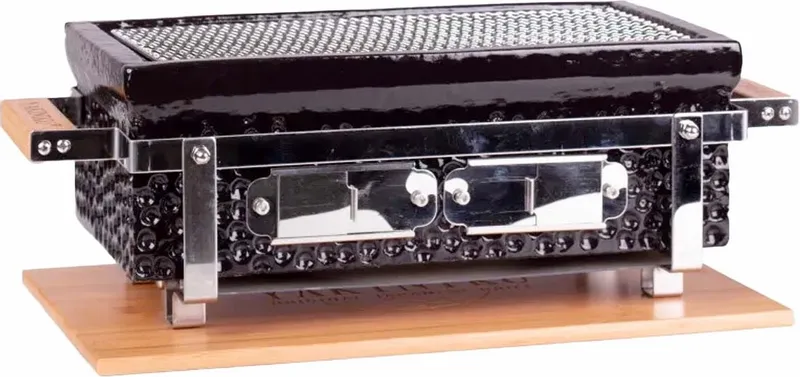 Deze rechthoekige barbecue van YAKINIKU heeft een RVS-rooster en is alleen buiten te gebruiken met houtskool van Binchotan of zelf-ontbrandende briketten. De Binchotan houtskool is het zwarte goud van Japan, omdat deze kolen een extreem hoge temperatuur bereiken. Zo behalen de White Maitiew kolen maar liefst een temperatuur van 1000 tot 1200 graden! Met deze Shichirin barbecue haal je de complete Japanse keuken zo naar je achtertuin.